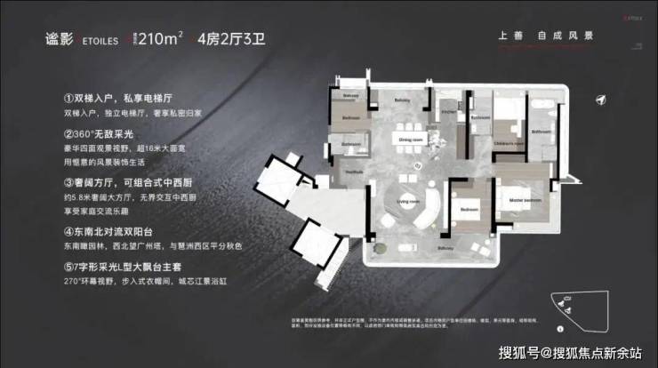 建面约210㎡户型,不仅做到三面采光,而且拥有超16米的南向面宽采光。南北双阳台,穿堂风得以直接灌入室内,尤其是270°南向巨幕阳台,更带来全面屏的自然美景。主套则采用了曲面转角飘窗设计,形成了约6.5米的全景转角大飘窗,在家里便可欣赏别人享受不到的窗景。而