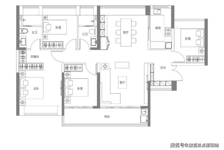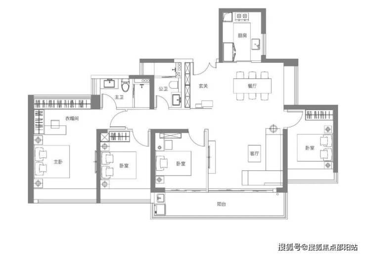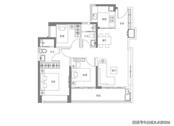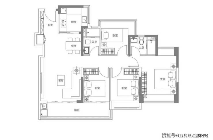 112㎡4房2卫:进门设有玄关,保障隐私与收纳需求。客厅开间达3.9m,LDKB一体化设计,动静分区合理。客厅连接次卧大阳台长6.5m。客厅,主卧、两个次卧四开间朝南,且主卧、次卧均带飘窗。主卧17㎡,次卧10.26㎡-9.06㎡-8.32㎡,得房率95%,东北-西南-东南朝向!