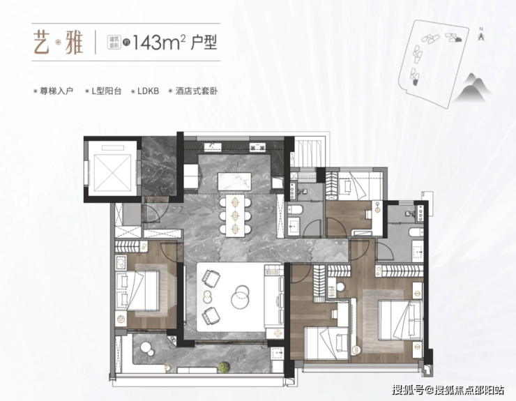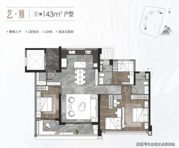 143㎡户型同样尊梯入户,L 型阳台增加了空间的灵动性,LDKB 设计让公共空间更加开阔,酒店式套卧提升了居住的舒适度。