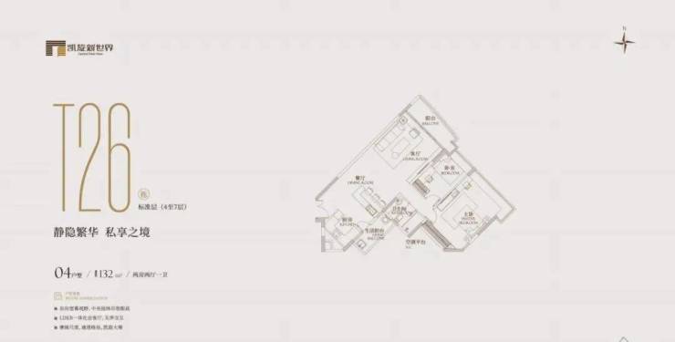 🏠户型超惊艳:从 132㎡精致两房起步,开启奢居体验,分布在t10、t26栋的3-9层,2梯3-4户,有两房一卫。