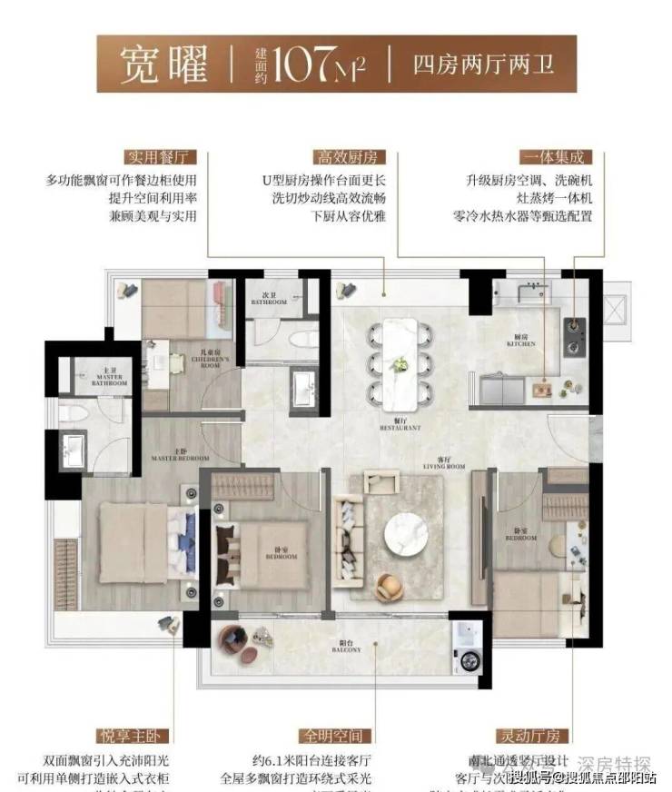 107㎡的4房2厅2卫,设计的是竖厅南北通透格局,客餐厅分离设计,四开间朝南,主卧270°转角飘窗,U型厨房,公卫三段式干湿分离,得房率约90%(包含赠送),客厅连接餐厅出6.1米长的大阳台,西南朝向。