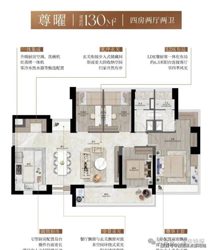 130㎡的4房2厅2卫,设计的是横厅南北通透格局,进门礼序玄关可做800库,LDK设计,五开间朝南,主卧270°转角飘窗,U型厨房,卫生间干湿分离,得房率约90%(包含赠送),客厅连接次卧出6.5米长的大阳台,东南朝向。
