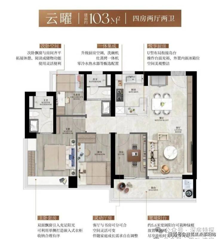 103㎡的4房2厅2卫,设计的是竖厅格局,LDKB一体化设计,动静分区,四开间朝南,主卧270°转角飘窗,U型厨房,公卫三段式干湿分离,得房率约90%(包含赠送),客厅连接餐厅出5.6米长的大阳台,西南或东南朝向。