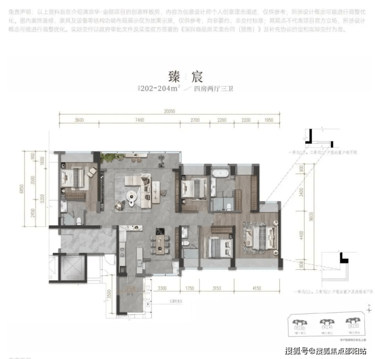 【产品户型】:建面约202-204㎡四房两厅三卫