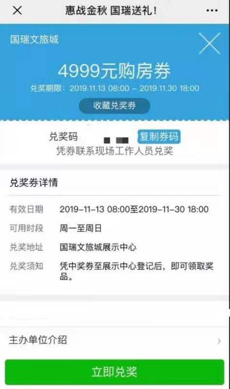 兑奖地点:中奖之后在兑奖时间内前往国瑞文旅城展示中心登记后即可免费领取奖品