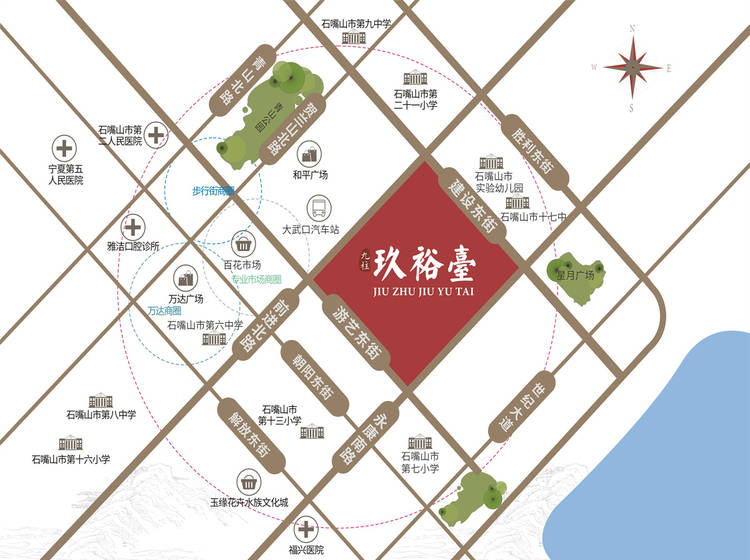 周边商业:步行街商圈、百花市场、华欣百货、新百连超、万达商圈。 周边医疗:石嘴山市第二人民医院、宁夏第五人民医院。 周边公园:和平广场、青山公园、森林公园、星海湖湿地公园。 周边学校:石嘴山市实验幼儿园、石嘴山市七小、十三小、十七中、六中