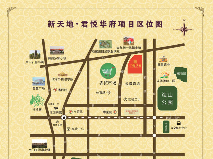 生活配套:从项目开车往南3分钟可以到达鹿泉北国商城,它是及餐饮购物为一体的商业综合体,可以满足您一站式的购物所需;小区西侧的鹿泉农贸市场和鹿泉集市还有项目本身的沿街商业,充分满足您的日常生活所需。
