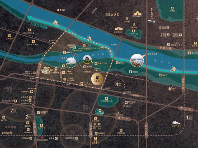 生活配套: 项目西侧为一站式社区综合服务中心和社区公园,引入文化、体育、医疗、养老、商业、绿地休闲等复合功能,满足日常生活需求,项目南侧为商业综合体项目,购物、休闲不必原则。项目5公里范围内覆盖北国益庄购物中心和保利广场两大商圈。沿体育大街与河北大道,可到达华北首家砂之船奥莱商业中心。乘坐地铁可方便到达裕华万达广场(4号线)、北国-勒泰商圈(2号线)、长安万达广场(4号线-1号线)