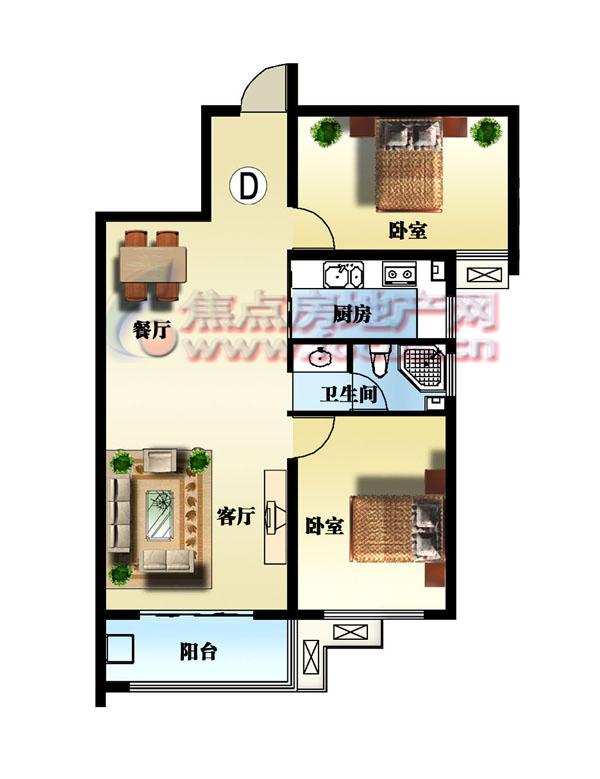 2室2厅1卫-名仕苑89-94平方米两室两厅一卫D