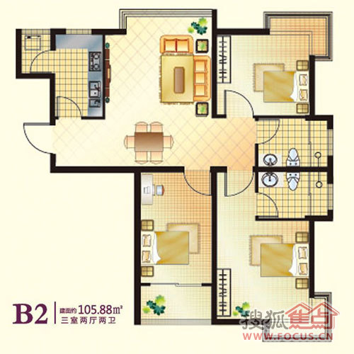 3室2厅2卫-三室两厅两卫105.88平米B2