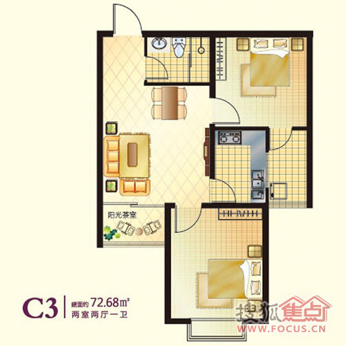2室2厅1卫-两室两厅一卫72.68平米C3