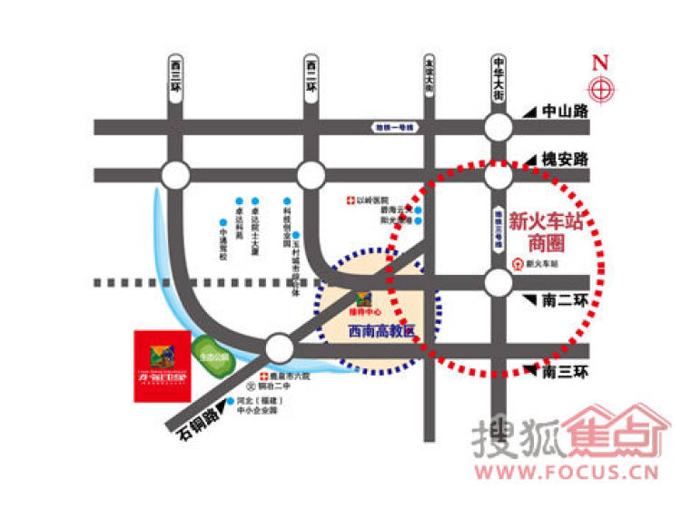 龙强印象位于城市西南高教区板块,南二环与石铜路交叉口南行3000米路西,距离新火车站4公里,毗邻新火车站商圈,地理位置优越周边配套齐全。新火车站的启用将极大推动周边区域发展,项目升值潜力不可估量。