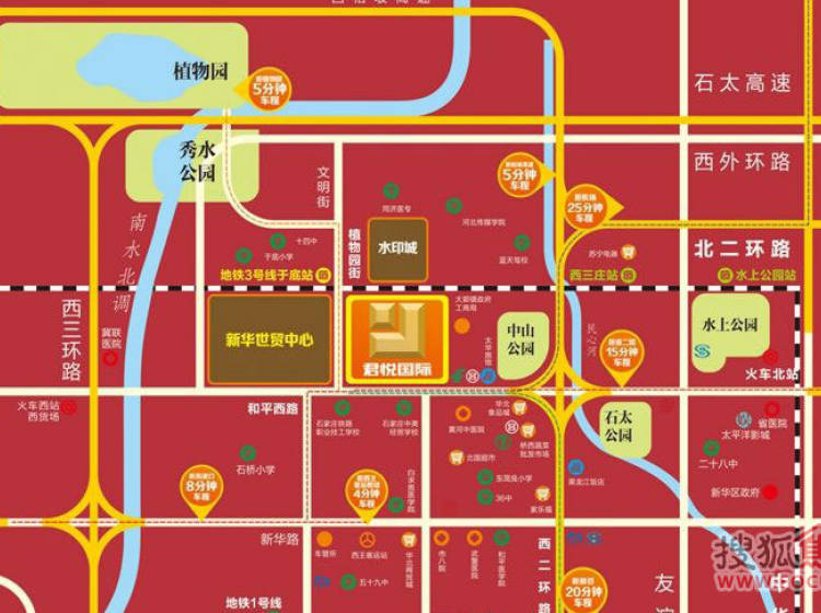 君悦国际区域交通便利,位于西北区域的门户位置,也是未来区域内的交通中心。南侧紧邻和平路,和平路向东是连接石家庄东西的重要城市主干道,西侧的植物园街向北通达植物园,未来会打通到新华路,而项目北侧300米即为地铁3号线“于底”站。