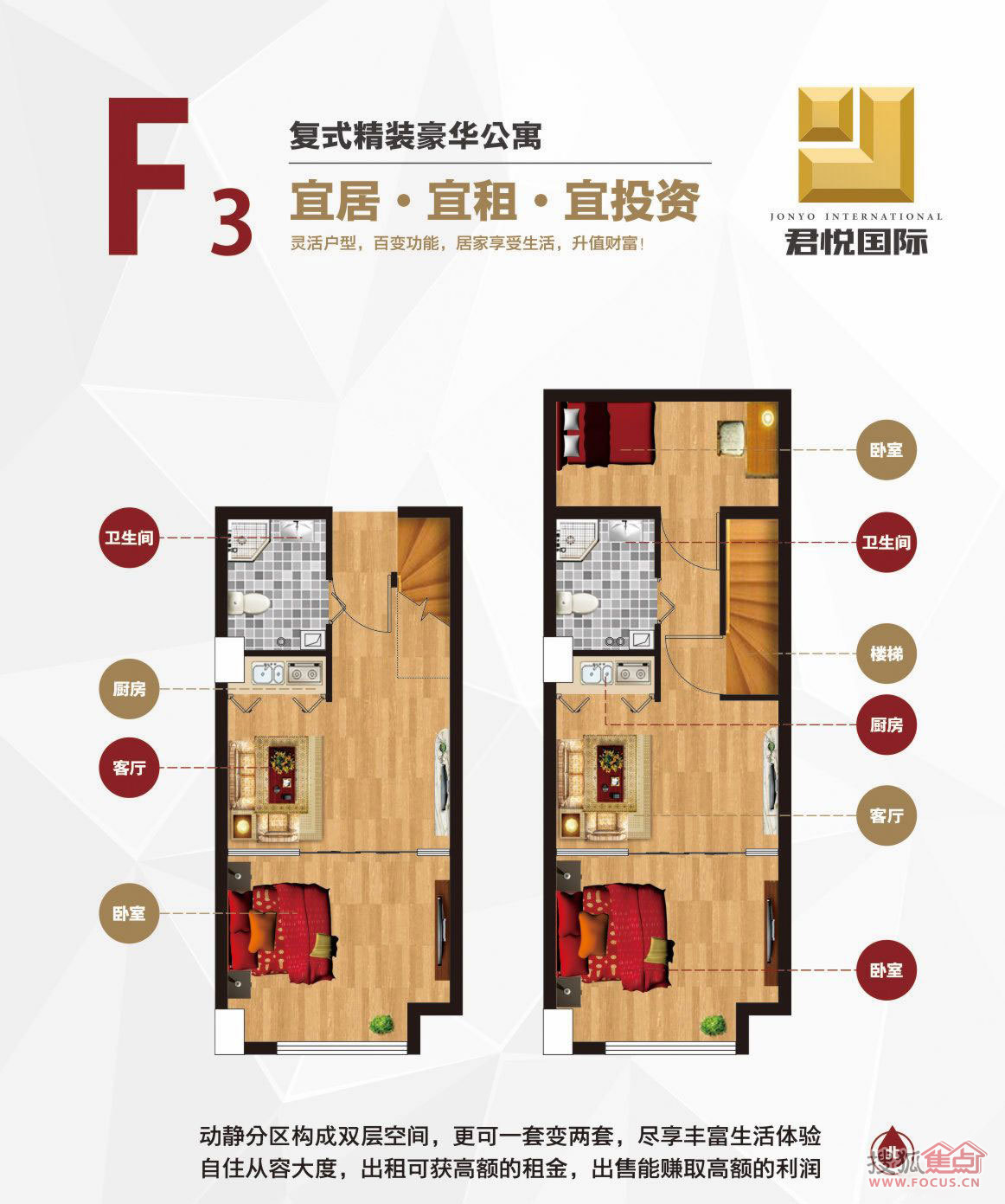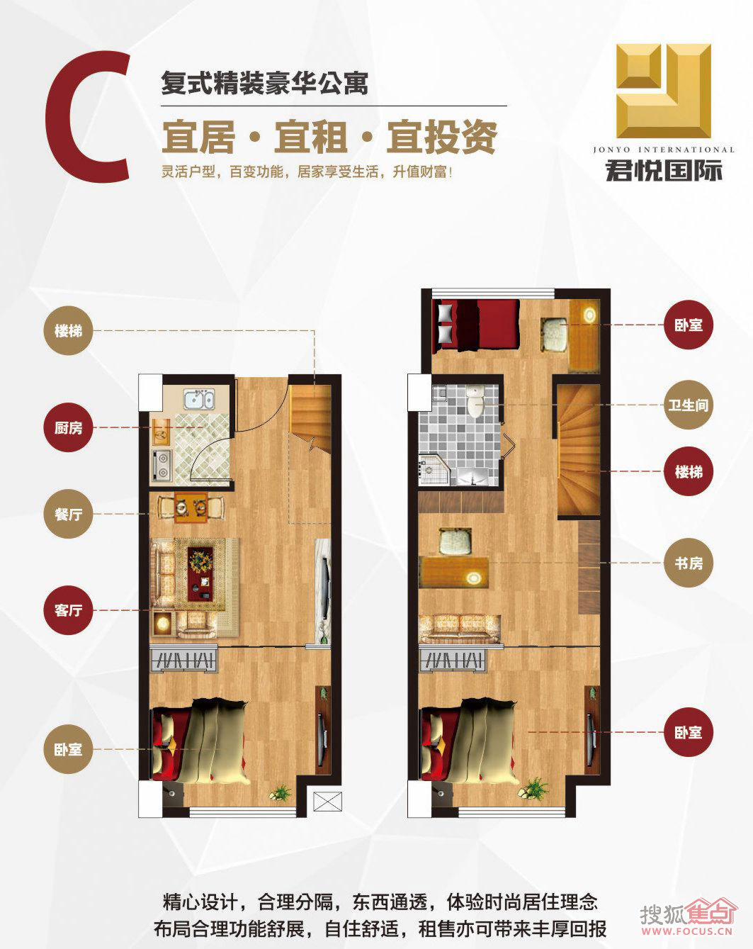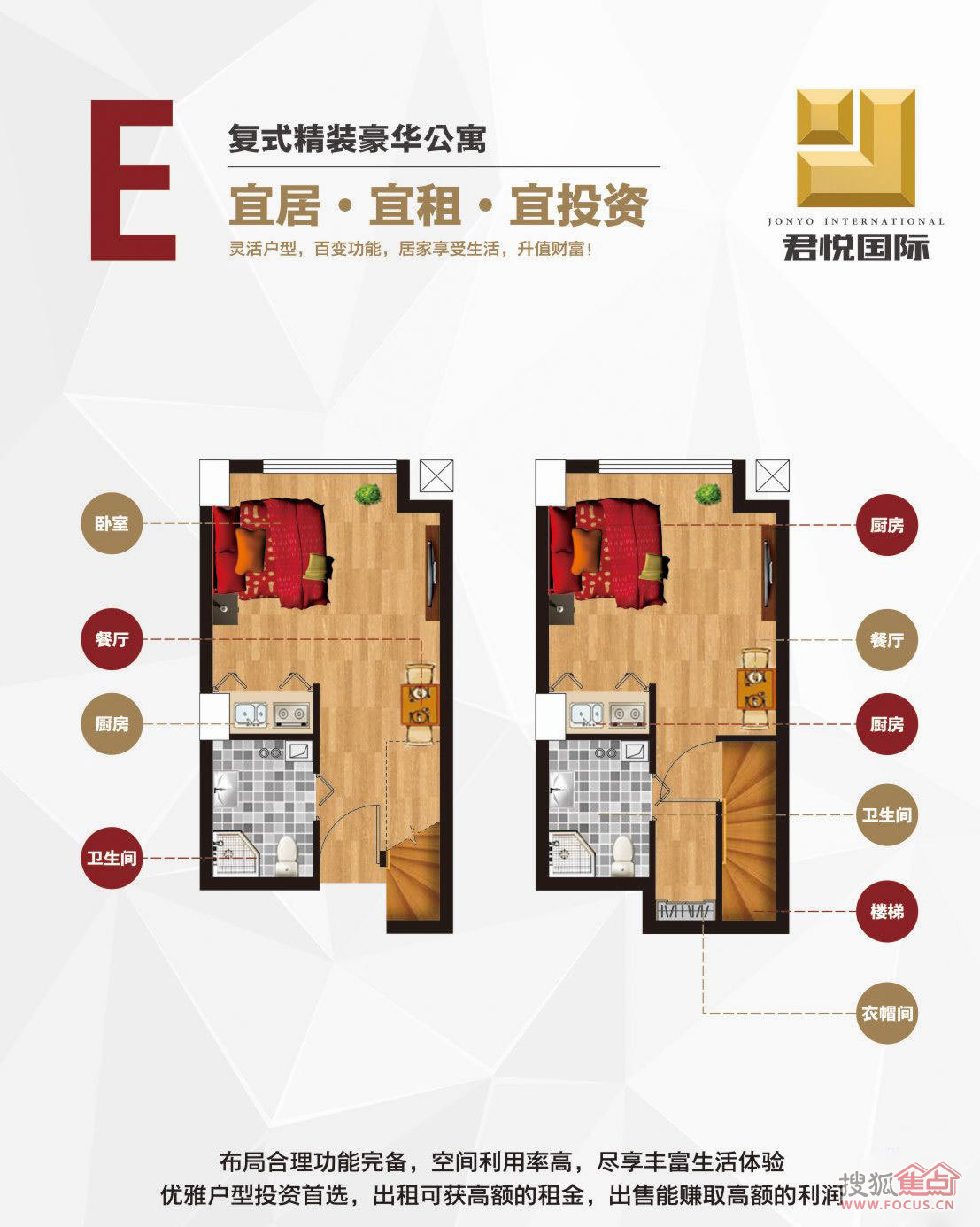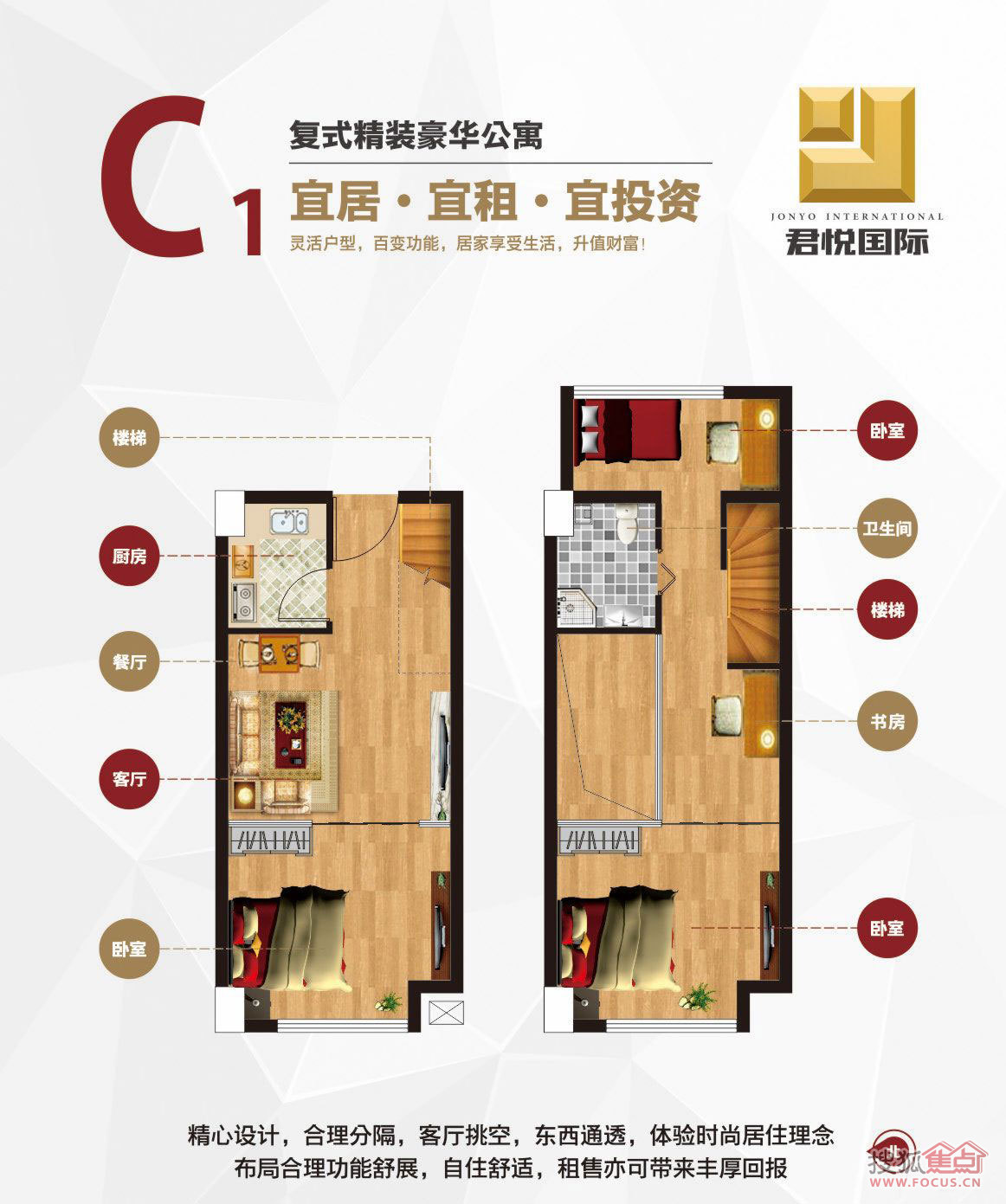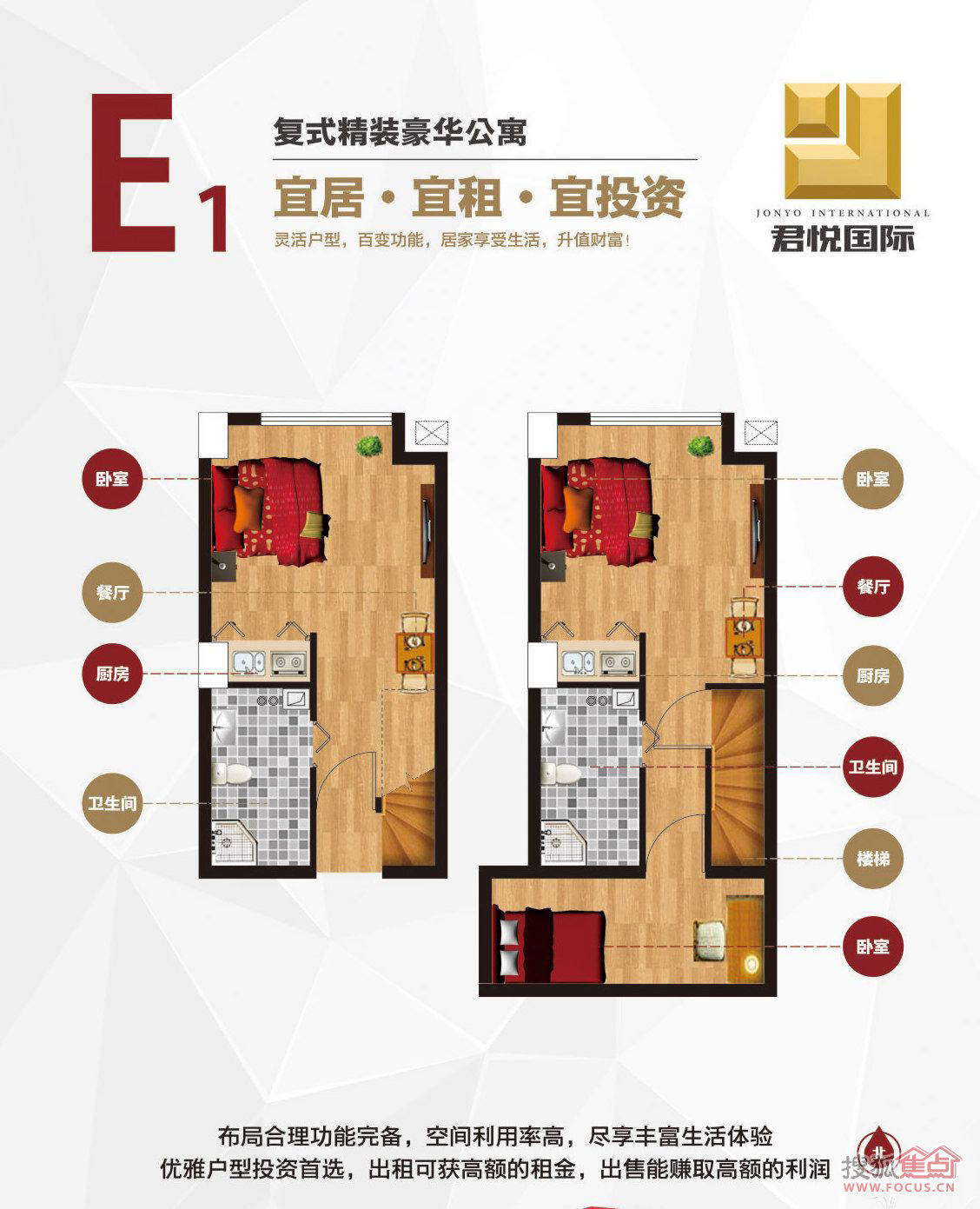 君悦国际整体建筑采用高端的外观设计,高档次的建筑材料,德国包豪斯后现代主义风格,石材和玻璃幕墙式外立面。5.4米挑高复式公寓,送精装。