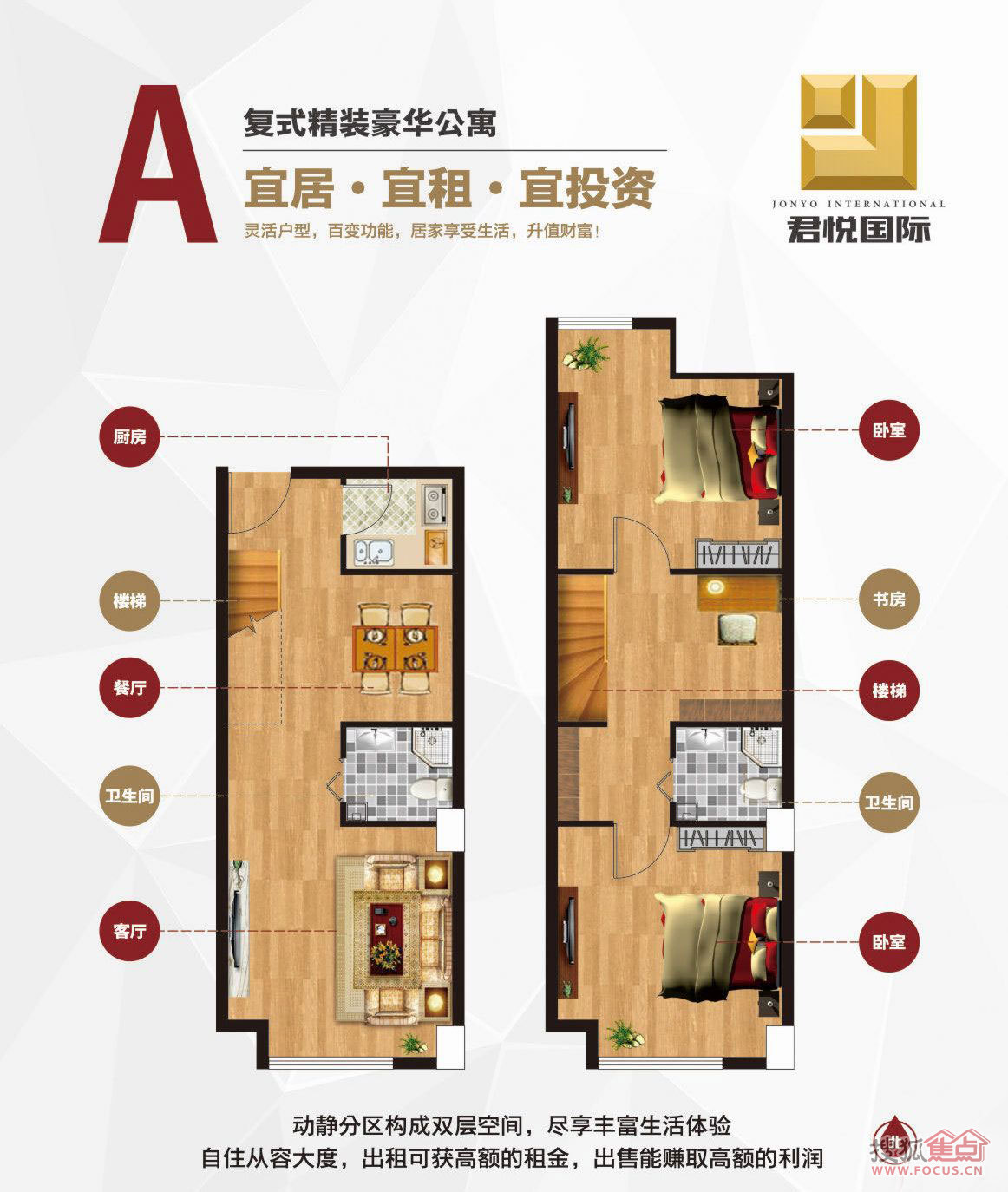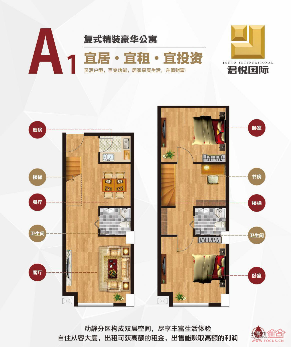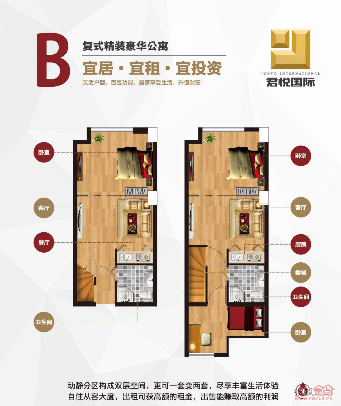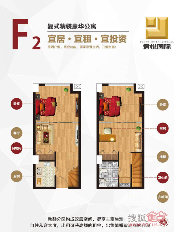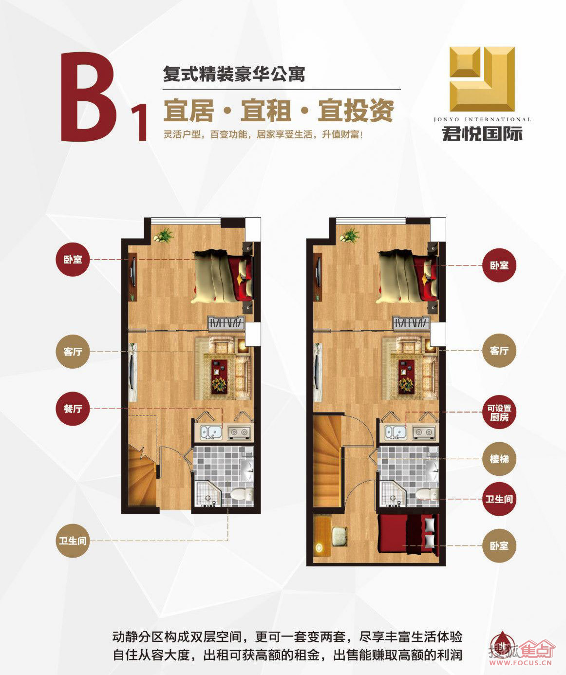 君悦国际整体建筑采用高端的外观设计,高档次的建筑材料,德国包豪斯后现代主义风格,石材和玻璃幕墙式外立面。5.4米挑高复式公寓,送精装。