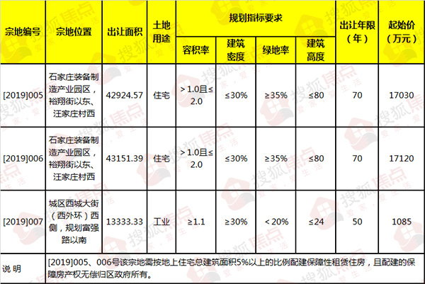 [2019]005号地位于石家庄装备制造产业园区,裕翔街以东、汪家庄村西,宗地面积为42924.57平方米(约合64.39亩),容积率>1.0且≤2.0,建筑密度≤30%, 绿地率≥35%,土地用途为住宅,出让年限70年,起始价为17030万元;