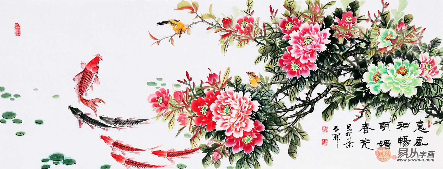 石开老师六尺横幅牡丹图《惠风和畅 明媚春光》(作品来源:易从网)
