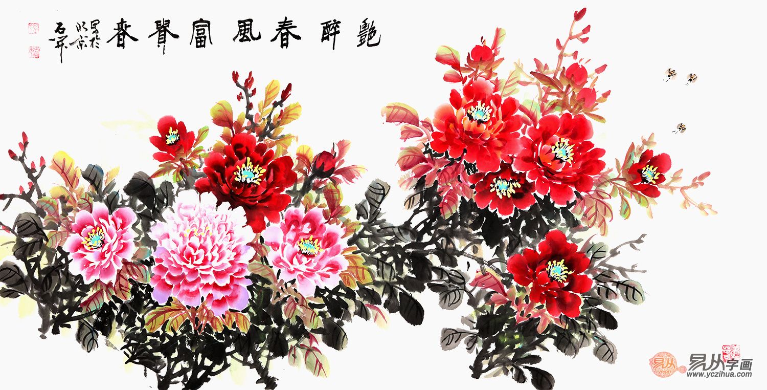 国礼书画家石开四尺横幅牡丹图《艳醉春风富贵春》(作品来源:易从网)