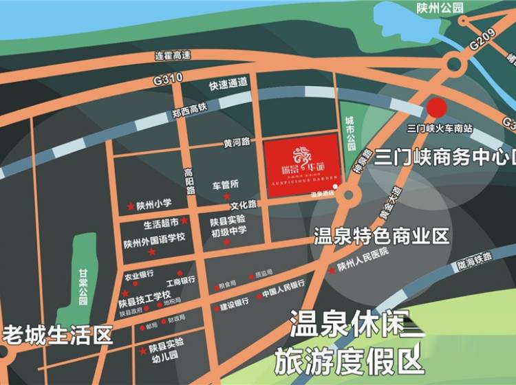 中小学 陕州小学,实验初中,外国语小学,外国语中学 大学 综合商场 千禧购物广场,星舟量贩购物广场 幼稚园 实验幼儿园 银行 建行,农行,工行农村信用社 邮局 邮政储蓄 医院 三门峡市第三人民医院 休闲娱乐设施 翡翠丽池 餐厅 江南小厨,神泉大酒店