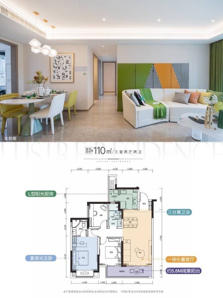 户型:110㎡进阶舒雅三房,套三双卫,经典坚厅格局,更有约5.8m阔景阳台,享270°全景采光;超22㎡主卧套房,独立卫浴、飘窗、衣帽空间,升维空间精致感。