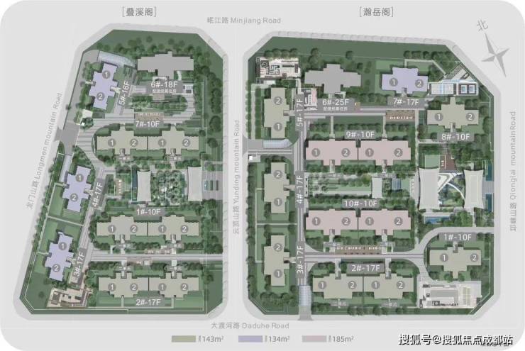 基本信息:占地35.15亩,总户数324户,共10栋楼,有10F、17F的小高层和洋房。产品面积为平层134-185㎡,梯户比有1梯2户和2梯2户,容积率2.5,物业费3元/月/㎡,由龙湖物业提供服务。