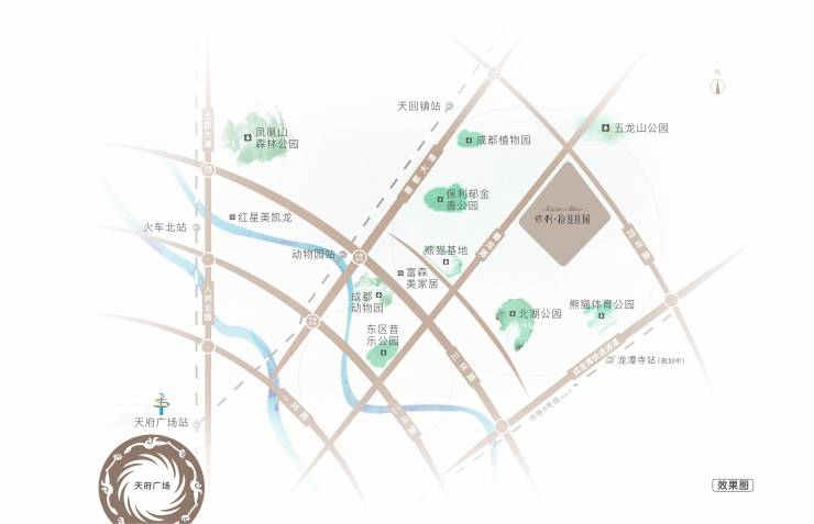 项目择址成都新都区五龙山高端住区,雄踞城市三环黄金地段。坐享198生态核心区优质资源,毗邻3700亩北湖生态公园及国宝熊猫基地,尽揽稀缺生态景观。