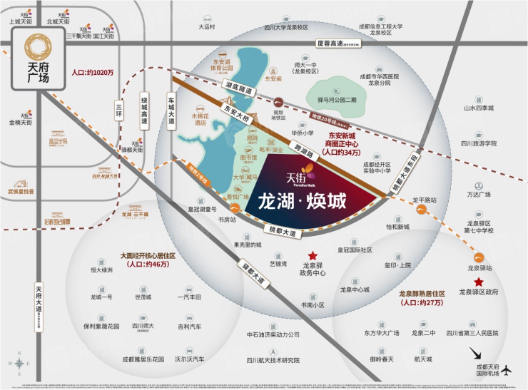客流中心:两快三主三轨道交通将全城人群汇聚,赛事地标吸引世界观赛人群,CAZ产业/居住区拥有约34万人口,大面经开核心居住区拥有约46万人口,龙泉醇熟居住区拥有约27万人口