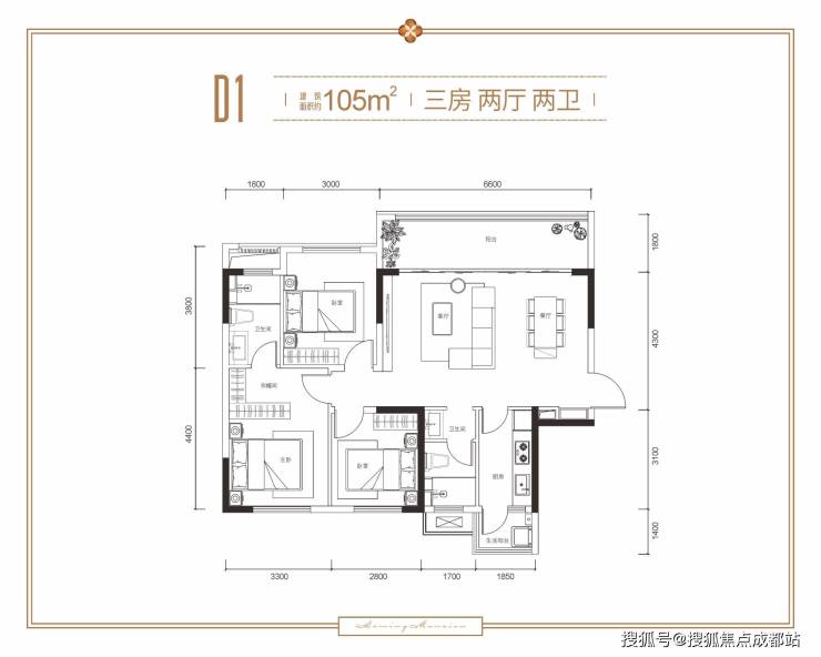 D1建面约105㎡三房两厅两卫双阳台;