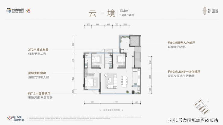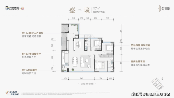 布局亮点:2梯2户板式结构,约11㎡阳光前厅私梯入户,7.1米开间巨幕横厅连接景观阳台,主卧套房设计。