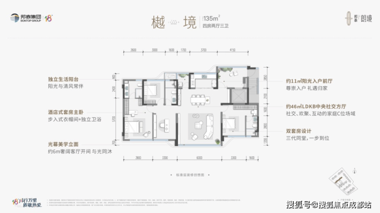 135㎡樾境四房:双套房设计,中央社交方厅