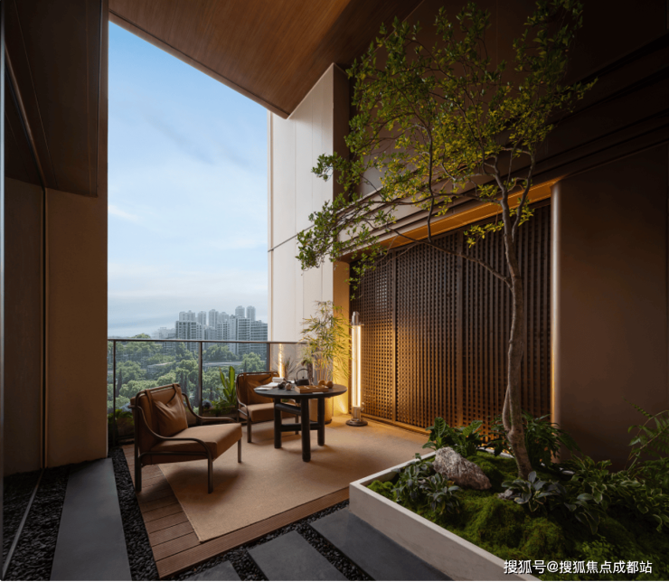 最大约7米层高的错层花园露台以"光影入庭,自然共生"为核心理念,特别设计约50cm降板,为空间赋予更多可能性。