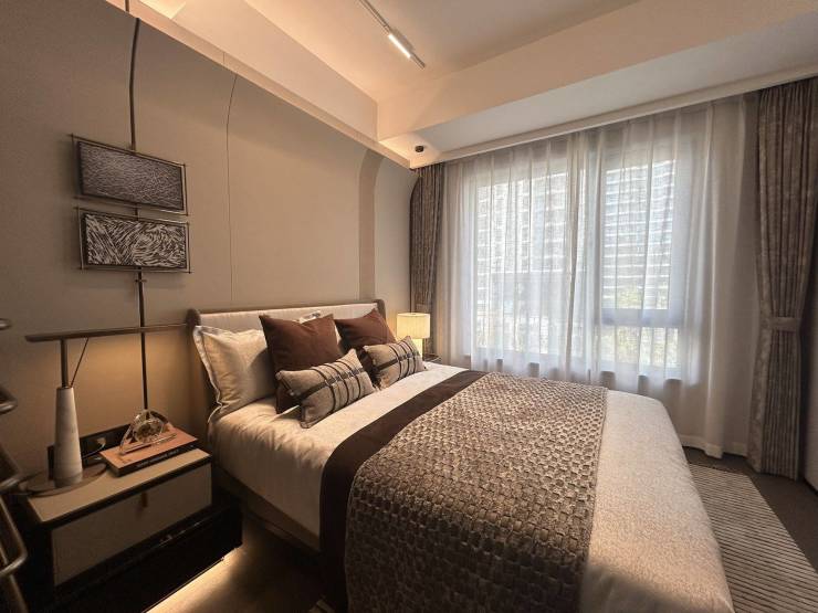 126㎡的户型为2梯2户,独立入户,拥有双面采光的电梯前厅;15米面宽+4.5开间朝南,拥有极好的日照、采光和观景效果;得房率约92%。