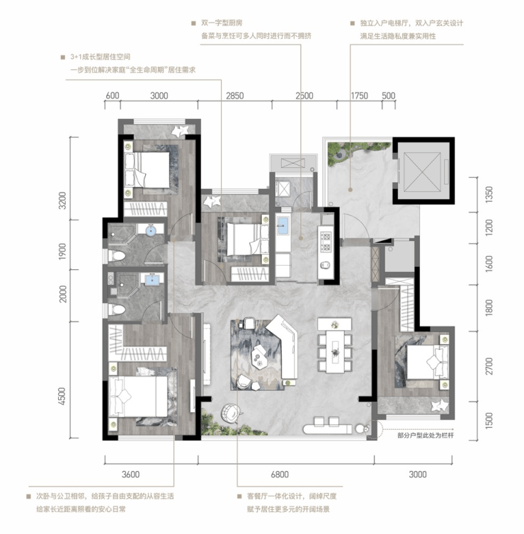 ■ 采用阵列式建筑排布,实现户户南北通透;45-175米超大楼间距,确保无遮挡景观视野;主力户型为建面134-143㎡全能四房