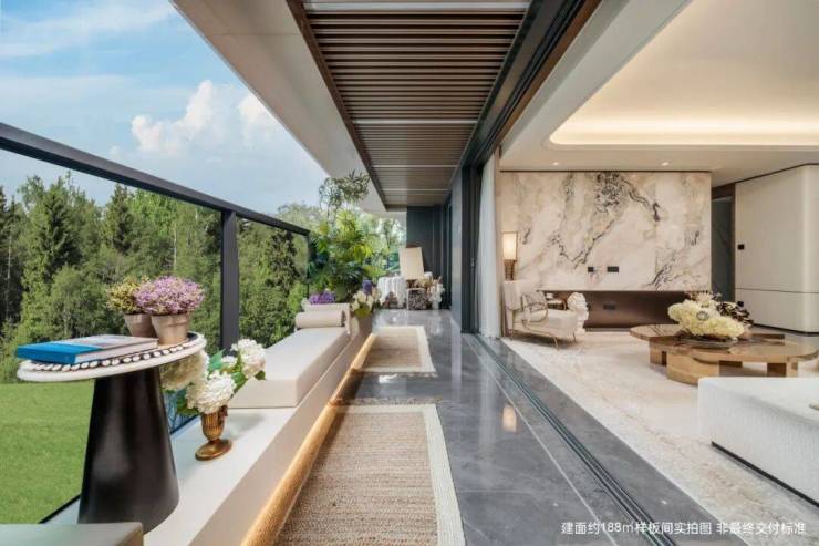 公共空间营造:入口大门选用白冰玉石材手工精琢,架空层与入户大堂铺设法国木纹大理石,地上大堂面积自90㎡起,地下大堂配置劳斯莱斯同款星空顶设计,双大堂均配备冷暖空调系统,营造星级酒店式归家体验。