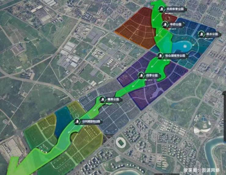 500亩主湖区已开放,串联七大主题公园体系,包括天府体育公园、湿地公园等,形成约1000亩生态绿廊。