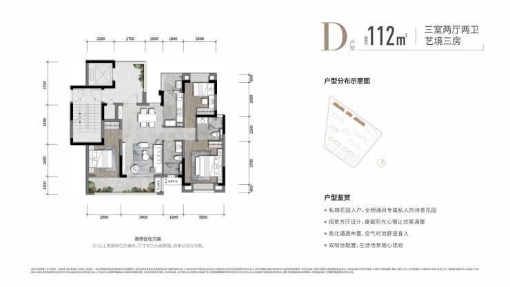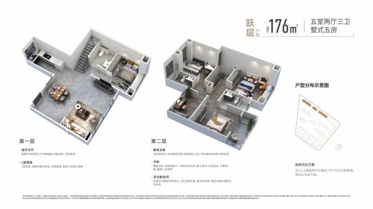 107m²/112m²/116m²三室两厅两卫;140m²四室两厅两卫;176m²五室两厅两卫(跃层)
