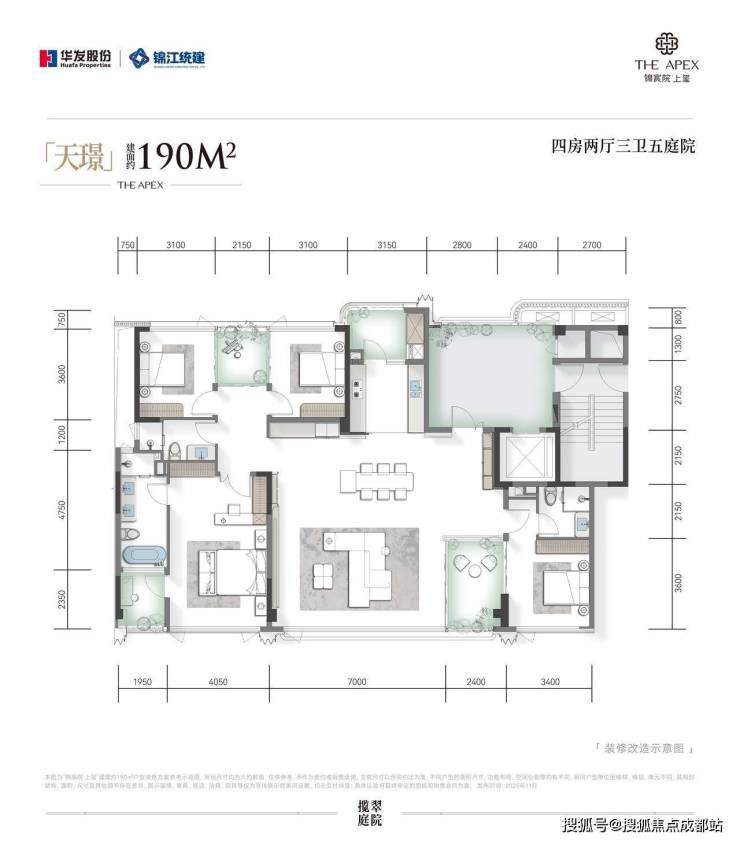锦宸院·上玺主力户型为190-329㎡的进阶奢宅,实现一梯一户、独立入户光厅、户内多平院空间、多套房等配置。以建面约190㎡户型为例,该户型得房率显著提升,空中庭院从3个增加至5个。