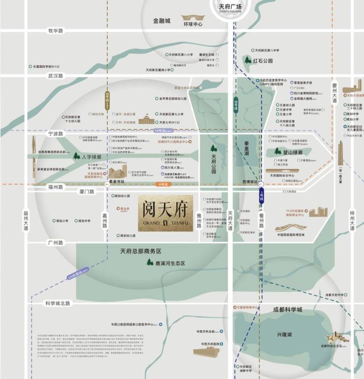 公园:天府公园(3km 内 23 个公园)、鹿溪河生态区、兴隆湖湿地公园。