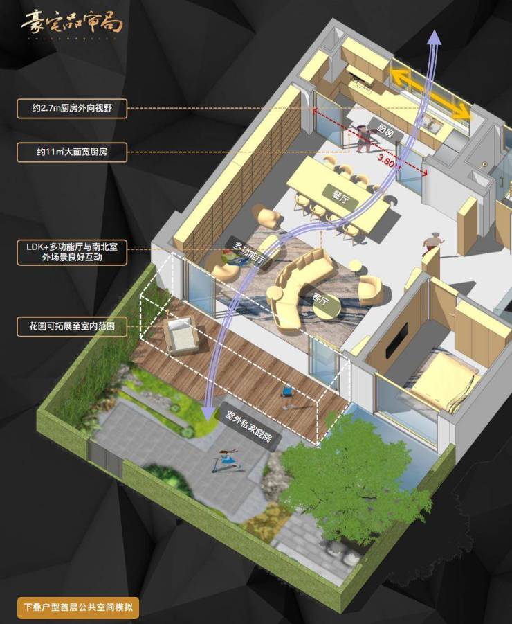 通过下方模型,可以感受一下首层公区LDK厅和花园的穿透关系,通风采光效果极佳。
