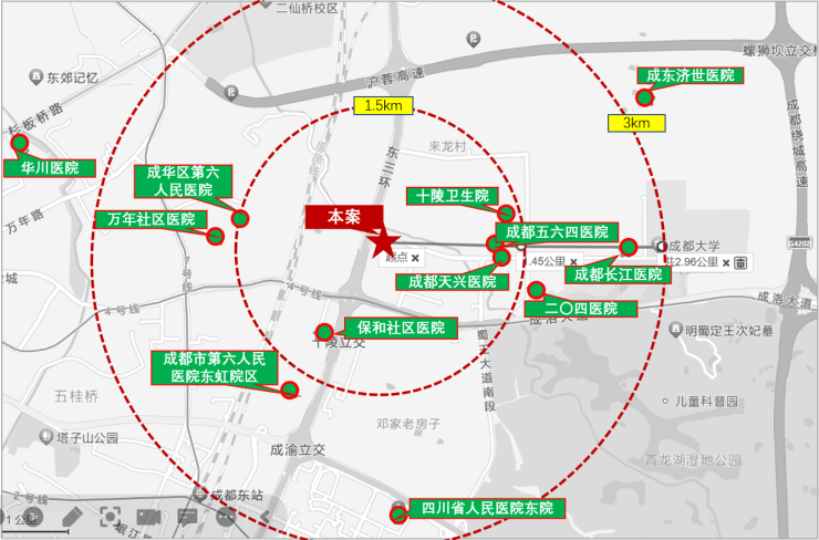 医疗:1.2km有成都五六四医院、1.8km有成都东升医院、2.1公里有成华区第六人民医院,2.8km有省医院东病区(为国内医疗等级最高的三级甲等医院,是片区域具备120急救和120服务的大型综合性医院),不仅可满足日常医疗需求,且满足15分钟黄金救援时间,并在相对适合的距离。