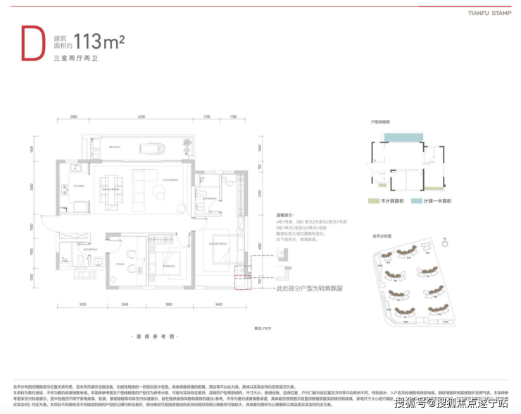 户型设计亮点突出:97㎡实现三房两厅双卫全能布局;9.8米南向面宽,三面采光确保通透性;3.6米客厅与3.3米主卧尺度考究;主卧及书房配备0.7米进深飘窗,拓展实用空间。