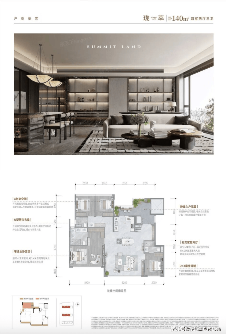 龙湖锦江峯萃主力户型为建面约 126㎡、140㎡四房产品,整体面向改善家庭,没有小户型混杂,圈层更加纯粹。