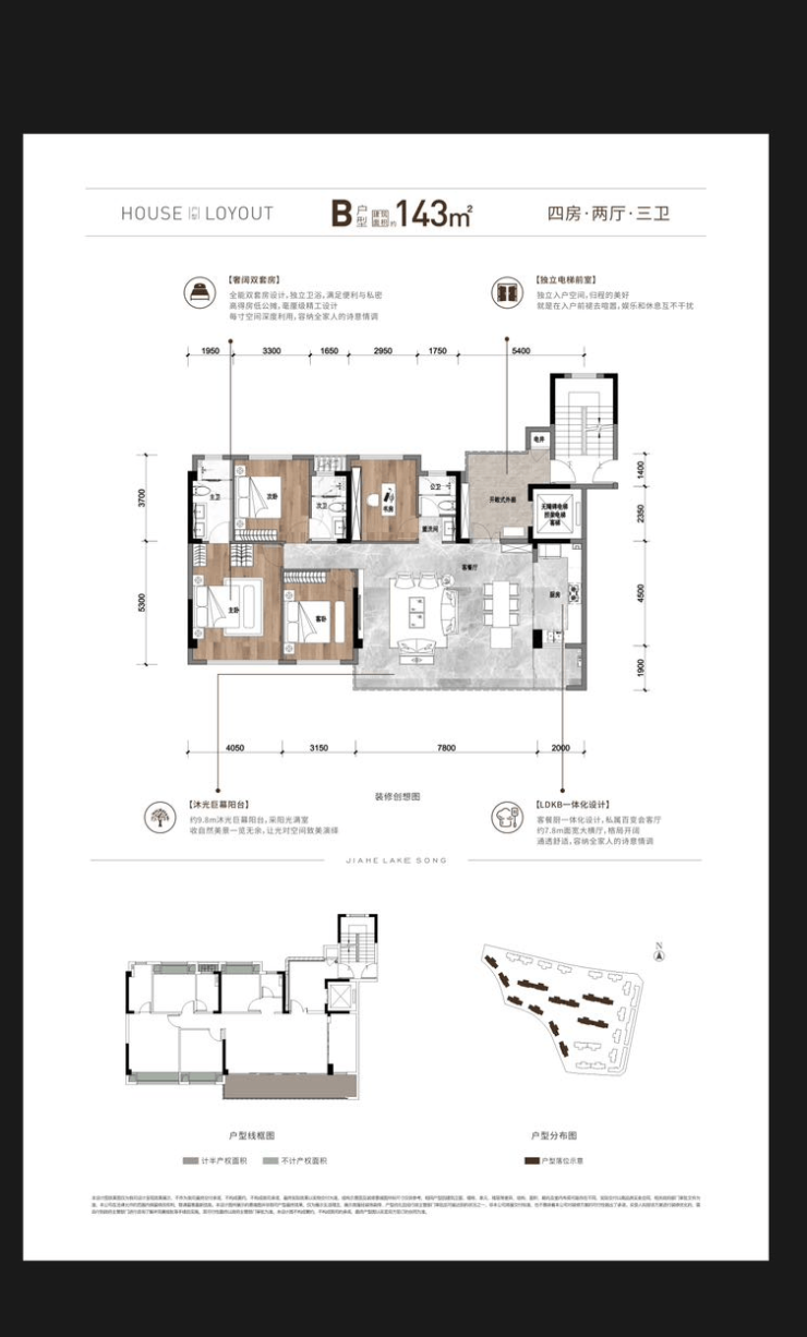 四房两厅三卫/建面约143㎡(赠送下来约180平;实得约157平)