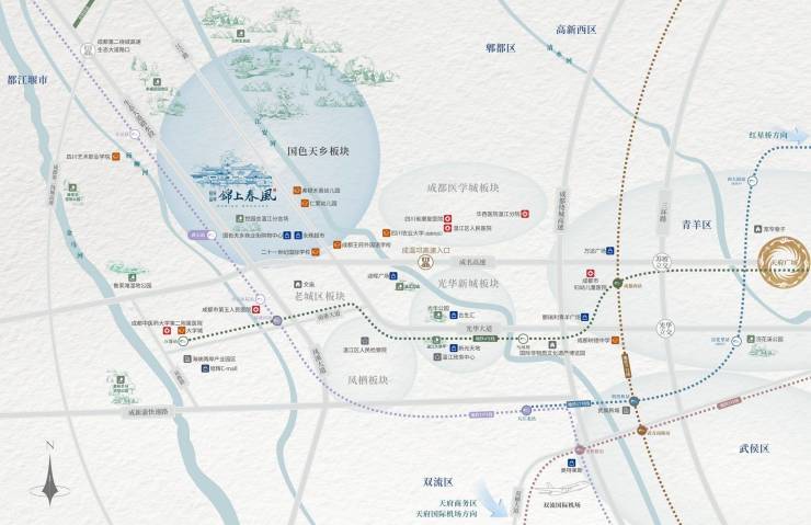 项目择址成都西贵之地温江,距主城区仅15公里,坐享地铁4号线、17号线、19号线三轨交汇的便捷交通网络。国色天乡板块集生态宜居、文化休闲、旅游度假于一体,完美融合城市繁华与自然静谧。