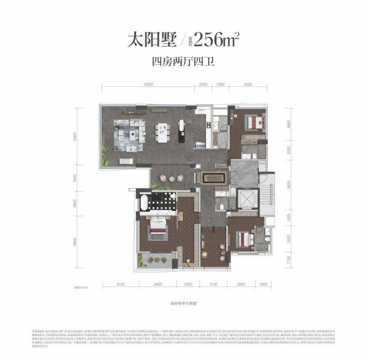 此户型拥有约20.8米的南向面宽,约78㎡的双厅,朝南设置了四卧双套房。入户光厅、独立玄关,搭配充满仪式感的LDK一体化空间,岛台配置中西双厨,共同构成了一个多元的室内社交场所。约41㎡的主卧,不仅私享独立衣帽空间,还配备双台盆盥洗系统,营造出如同星级酒店套房般的奢适格局。 建面约256㎡
