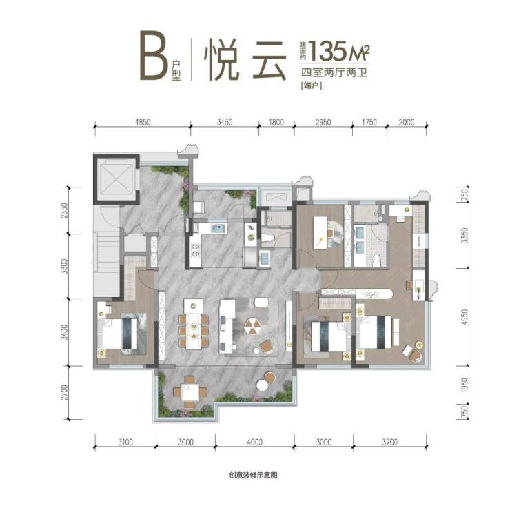 建面约114㎡户型创意装修图,非交付标准