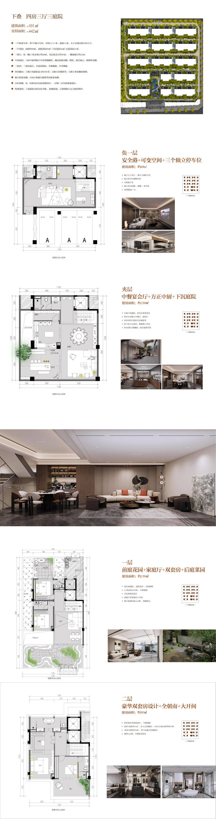 建面约101㎡,实得442㎡,带3个独立车库花园面积约90㎡(前厅花园约50㎡+下沉花园约26㎡+后庭花园约15㎡)