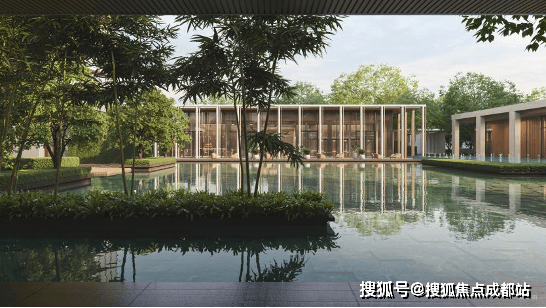 「LACADIERE天览」旨在营造“都市桃源,度假栖居”的心灵栖息地,其灵感根植于东方庭院的静谧留白。设计以轻盈悬浮的形态消解建筑体量,通过立体化空间营造出入户的仪式感与栖居的度假感,最终凝练为兼具东方意蕴与现代精神的庭院。归家成为一场东方美学的沉浸仪式,步履所至,景致渐开。约1500㎡的中心水景是这场仪式的灵魂舞台,绿奢石铺就的池底,将天光云影晕染成一幅流动的水墨画卷。