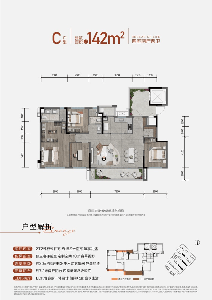 三卧朝南格局,7.2米景观横厅,主卧配备步入式衣帽间与双台盆卫浴。