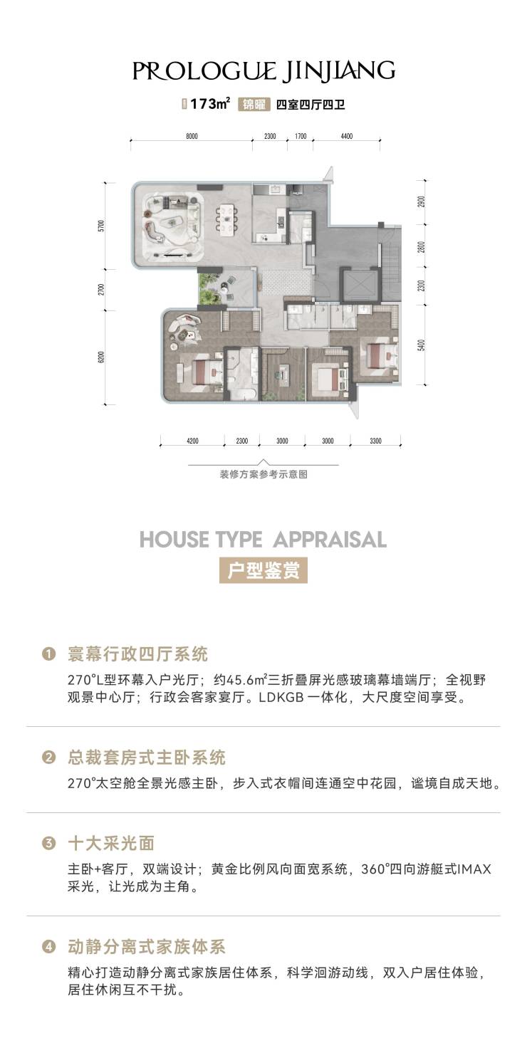 产品面积:125-173㎡ 户户瞰江濠宅;179-235㎡ 定制天际顶跃